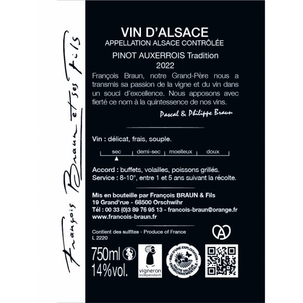 Les raisins destinés à l'élaboration de ce Pinot Auxerrois ont été récoltés mécaniquement le 27 septembre 2023